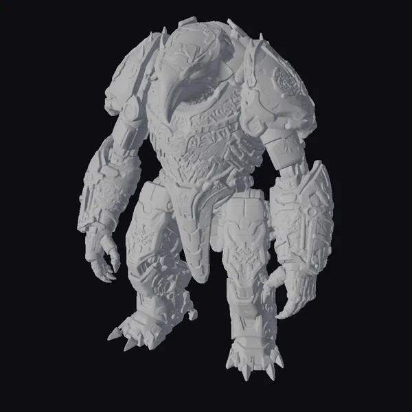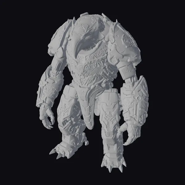 Detailed with precision, this armored sentinel robot model showcases a complex assembly of metallic plates and mechanical limbs. The body is predominantly a dark gray color with lighter gray accents, giving it a stark, metallic sheen. The robot’s posture is assertive, with its arms slightly bent and claws extended, suggesting readiness for action. The headpiece, resembling a helmet with a pointed visor, adds to its intimidating profile. This model is ideal for use in sci-fi games, animations, or virtual reality experiences where a strong, robotic presence is needed. Its intricate design and high level of detail make it suitable for close-up shots and scenes requiring a high degree of realism.