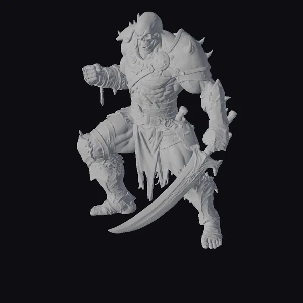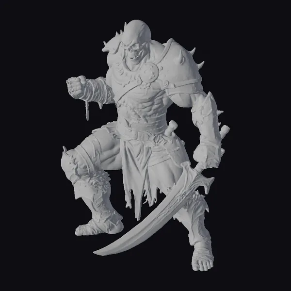 The Armored Skull Warrior stands imposingly, his muscular physique evident beneath the gaps of his dark, metallic armor. The armor itself is a marvel of detailed design, with spikes protruding from the shoulders and elbows, suggesting a creature not to be trifled with. His face, a skull-like visage, seems to revel in the chaos of battle, the snarl twisting his features. A large, curved sword, equally as menacing as its wielder, is gripped firmly, poised for a powerful strike. The warrior’s pose, legs spread wide and fists clenched, exudes a sense of readiness, as if he could spring into action at any moment. This model would be perfect for adding a touch of dark fantasy to games, animations, or any project requiring a formidable, mythical creature.