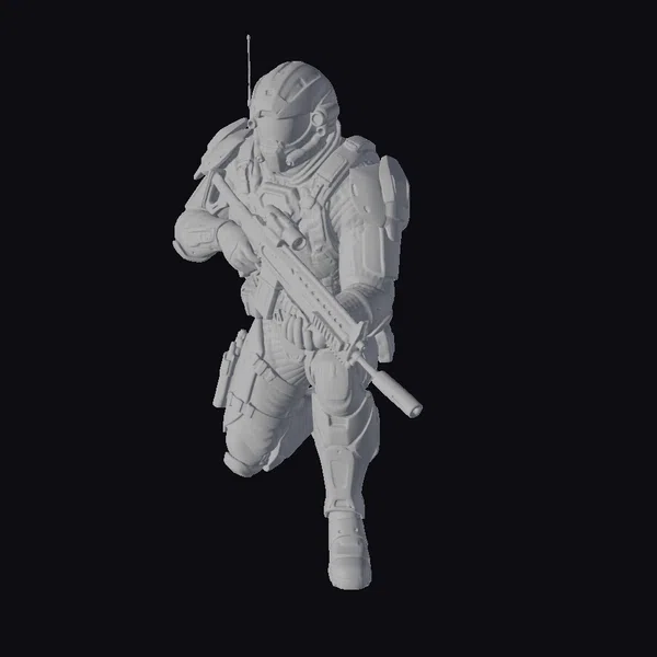 Standing tall with a powerful stance, the armored space soldier is a marvel of sci-fi design. The exosuit is a combination of silver and gray tones, with black accents that add depth and contrast. The helmet, complete with an antenna and an orange-tinted visor, gives the soldier an otherworldly appearance. The rifle, held firmly in the soldier’s hands, features a long barrel and a scope, emphasizing its use in high-stakes missions. The level of detail in the model, from the texture of the armor plates to the grip of the rifle, makes it perfect for use in games, 3D printing, VR/AR experiences, animation, and design projects. The futuristic look and feel of the model can instantly elevate any sci-fi themed project.
