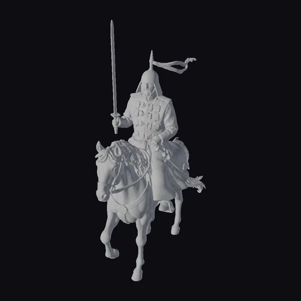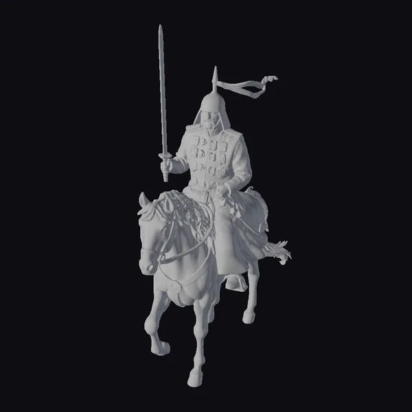 In a powerful stance, the armored warrior sits atop a dark brown horse, its muscles rippling beneath its shiny coat as it prances forward. The warrior’s blue uniform is a masterpiece of detail, with intricate gold accents and vibrant red and blue medals that catch the light. A gold helmet with a pointed top and flowing blue plume adds to his imposing presence. His sword, held aloft in a confident gesture, seems poised for action. This 3D model excels in its realistic portrayal, making it perfect for historical reenactments, animations, or video games where authenticity is key.