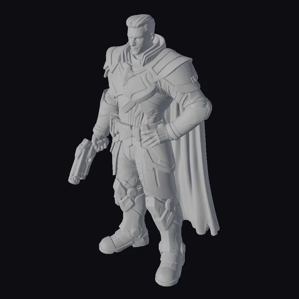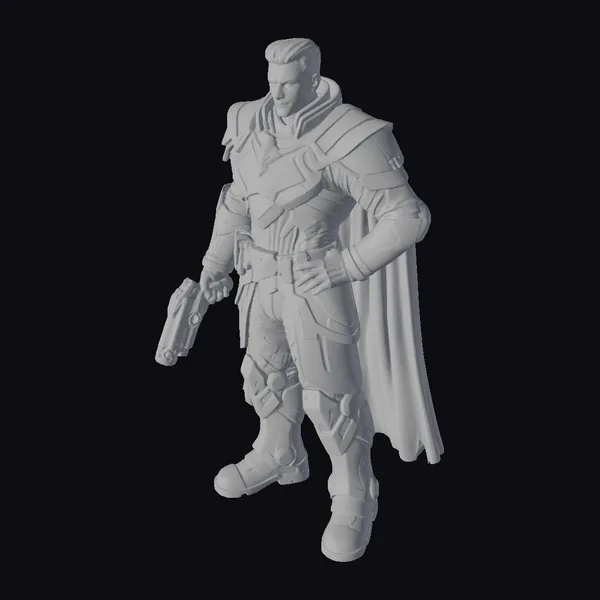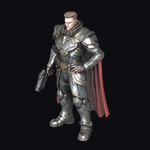 Detailed with precision, this character model showcases a sci-fi warrior in a dynamic pose, exuding confidence and power. The metallic armor, predominantly silver with gold accents, covers his body, complete with a helmet-less head to showcase his determined facial expression. A red cape billows behind, suggesting movement and adding a pop of color to the overall metallic palette. The model includes intricate details such as the texture of the armor plates, the grip of the pistol, and the folds of the cape. The blend of sci-fi elements with a medieval-inspired cape creates a unique character that could be used in various projects, from video games to animations, and even architectural visualizations for sci-fi settings.