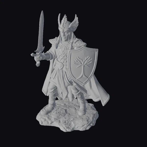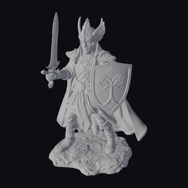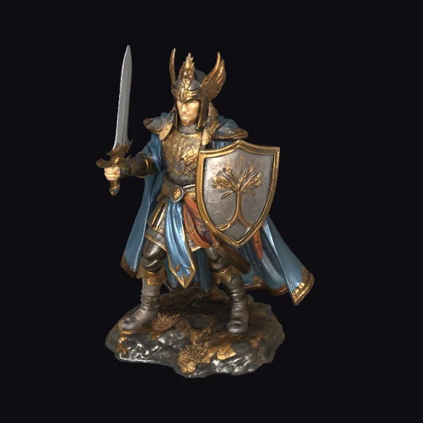 Positioned heroically on a rocky outcrop, the warrior’s armor shines with a mix of gold and blue hues, complemented by the silver and gold shield emblazoned with a tree emblem. The sword, held firmly in the warrior’s hand, appears poised for battle. The detailed textures of the armor, from the feathered helmet to the armored boots, are meticulously rendered. This model is perfect for use in games, 3D printing, VR/AR experiences, animation, and design projects, offering a richly detailed character to enhance any medieval or fantasy setting.
