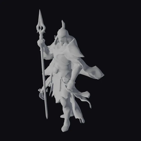 This ultra-realistic fantasy warrior model showcases a highly detailed face and body, encased in a sophisticated suit of armor that combines blue, gold, and silver tones. The armor is adorned with a flowing cape and a distinctive helmet featuring a pointed top. The warrior’s right hand firmly grips a long spear, its tip gleaming sharply. The model’s pose suggests dynamic movement, with the cape and clothing fluttering around the warrior. Ideal for use in games, 3D printing, VR/AR experiences, animation, and design projects, this model brings a touch of fantasy realism to any project. The high level of detail, especially in the face and hands, ensures a lifelike appearance.