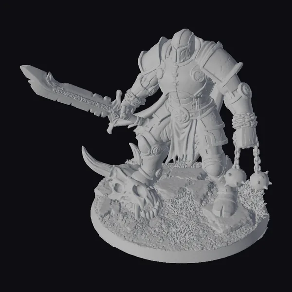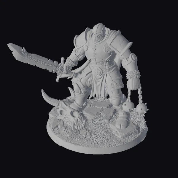 Positioned dynamically on a rocky outcropping, this armored warrior exudes an aura of battle-readiness. The figure’s armor is a marvel of detailed design, with metallic textures and bronze accents that suggest a storied history of combat. A flowing blue cape and a sword with a jagged blade add to the warrior’s imposing presence. A spiked mace hangs menacingly from the warrior’s hand, while a skull with curved horns rests at their feet, hinting at past conquests. The base, complete with patches of grass and dirt, grounds the figure in a natural, battle-scarred environment. Ideal for use in games, 3D printing, VR/AR experiences, animation, and design projects, this model brings a touch of dark fantasy to any project.