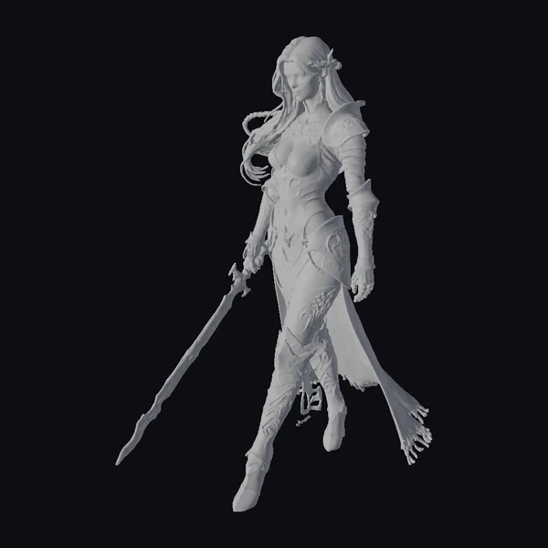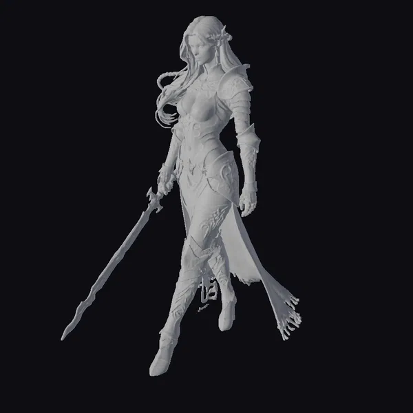 This meticulously crafted 3D model presents a female warrior in a dynamic pose, showcasing intricate details in her silver and gold armor, complete with a blue cape flowing behind her. Her striking red and white hair is styled in a braid, adding to her fierce yet elegant appearance. The warrior’s armor features elaborate designs, and she wields a large sword with a gold hilt, ready for action. The model is highly detailed, with precise textures and lighting effects that bring the character to life. Ideal for use in games, animations, or virtual reality experiences, this model is sure to make a bold statement.