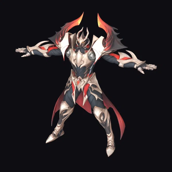 This stylized armored winged sentinel is captured in a dynamic pose, arms outstretched and wings spread wide, conveying a sense of readiness and guardianship. The armor is intricately designed with a mix of silver and black tones, highlighted by striking red accents that suggest a fiery essence. The sentinel’s face is shielded, adding to its mysterious and formidable appearance. The model is highly detailed, with clear definition of the armor’s texture and the wings’ feather-like structures. Ideal for use in game development, animation projects, or as a striking design element, this model brings a touch of fantasy and strength to any creative endeavor.
