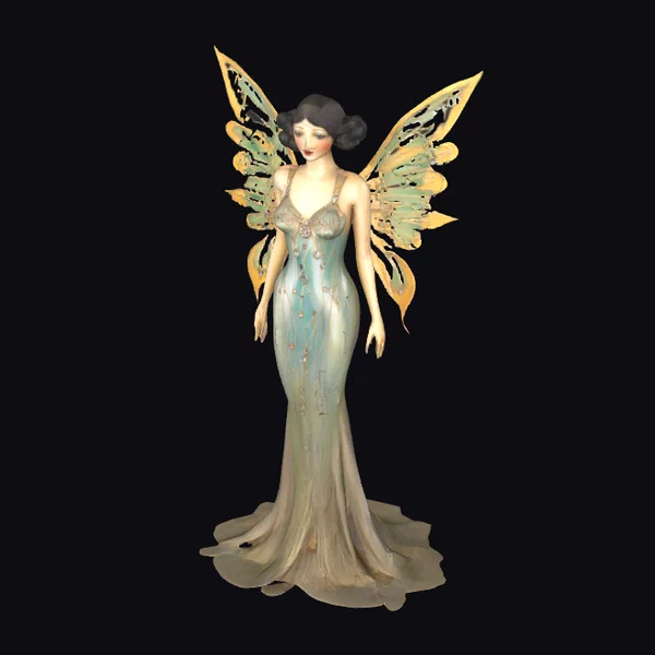 Intricately designed with an art deco flair, this fairy’s slender figure is draped in a floor-length, green gown that shimmers with subtle gold highlights, accentuating her mythical beauty. Her dark hair is styled in elegant buns on either side of her face, enhancing her serene and mystical aura. The fairy’s wings, a masterpiece of gold and green hues, are spread wide, showcasing their detailed, almost translucent quality. Positioned dynamically, the model invites the viewer to imagine her in various scenarios – from floating gently through a fantastical forest to being a centerpiece in an animated film or game. Her poised stance and elaborate attire make her a perfect fit for projects requiring a touch of elegance and fantasy.