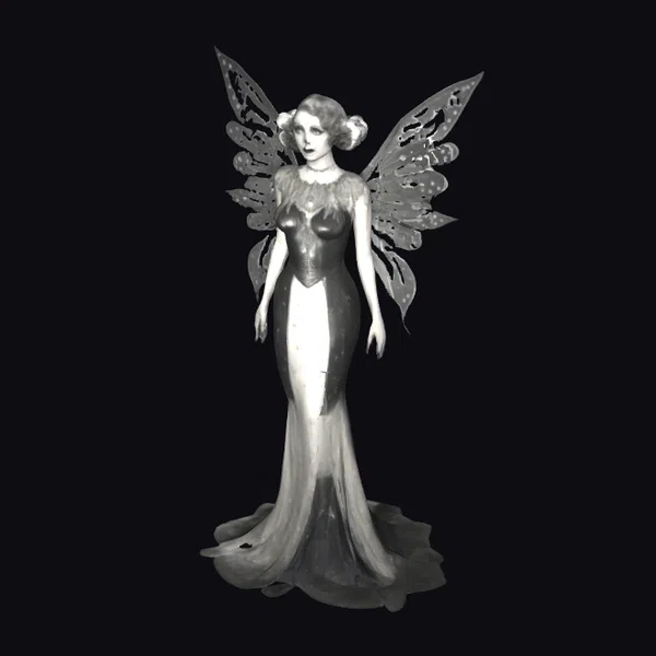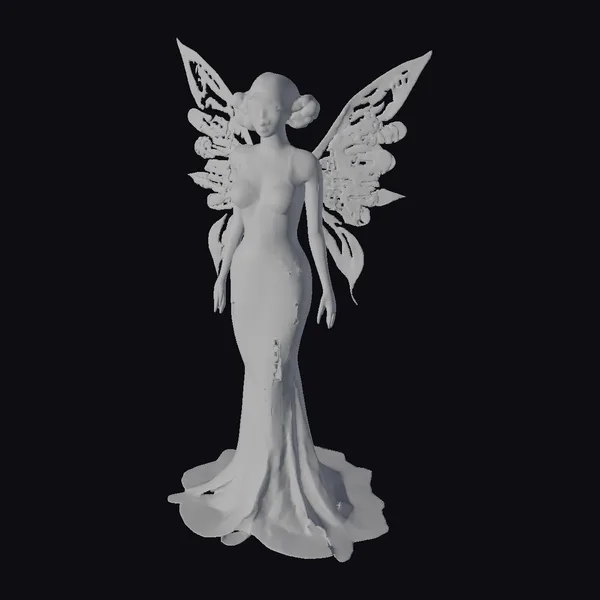 Rendered in exquisite detail, the art deco fairy’s form is a masterclass in stylized realism. Her dress transitions smoothly from a fitted bodice to a flowing train, with a subtle gradient of gray and black that catches the light. The fairy’s wings, a marvel of metallic filigree, appear almost liquid in their fluid design. As she stands in a gentle, flowing pose, her facial features are a study in subtlety, with a quiet confidence that draws the viewer in. This model is perfect for use in games, 3D printing, VR/AR experiences, animation, and design projects where a touch of vintage flair is desired.