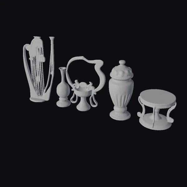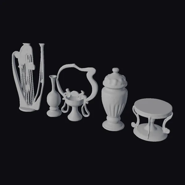 Gaze upon the intricate craftsmanship of these Art Nouveau-style metal decorative items. The collection features a majestic harp with delicate strings and an ornate frame, a slender vase with a reflective surface, an urn with a lid and etched patterns, and a small stool with a green marble top. Each piece boasts a rich, warm color palette and meticulous attention to detail. These models are perfect for adding a touch of elegance to 3D environments, games, or animations. Their intricate designs and textures make them ideal for close-up shots or as focal points in a scene.