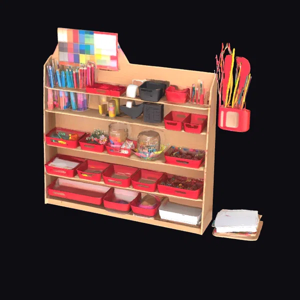 Detailed examination reveals a sturdy wooden organizer with multiple shelves, each meticulously arranged with an assortment of art supplies. The top shelf boasts a vibrant color palette, jars of brushes, and containers for paints and markers. Below, rows of red bins are filled with an array of materials, from paper and pencils to glue and glitter. A smaller tray on the side holds additional tools, completing this comprehensive creative workspace. Ideal for educational settings, gaming environments, or 3D modeling projects requiring a detailed workspace.
