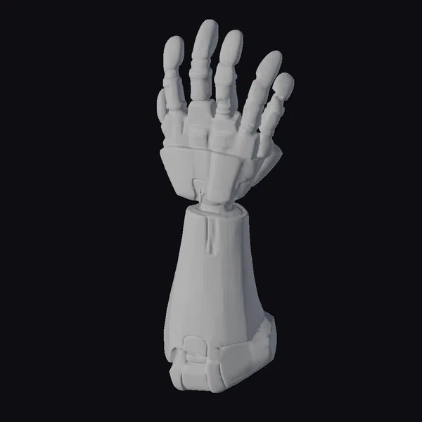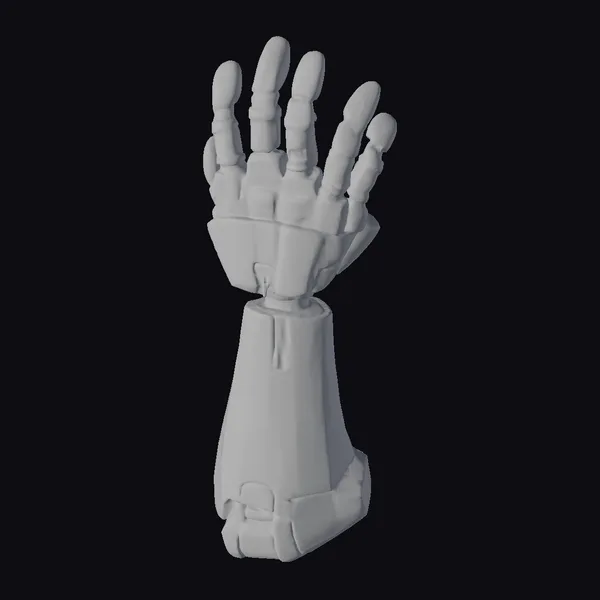 Detailed with precision, this robotic arm is posed in a dynamic stance, showcasing its fully articulated design. The arm and hand are composed of interlocking metallic segments, predominantly gray with gold accents along the joints and mechanical details. The fingers are individually articulated, allowing for a range of motions, while the wrist rotates smoothly. The model features a mix of rounded and sharp edges, giving it a futuristic yet robust appearance. Ideal for use in sci-fi projects, game development, virtual reality, and animation, this model brings a touch of advanced technology to any scene. Its high level of detail and flexibility make it suitable for close-up shots or dynamic movements.