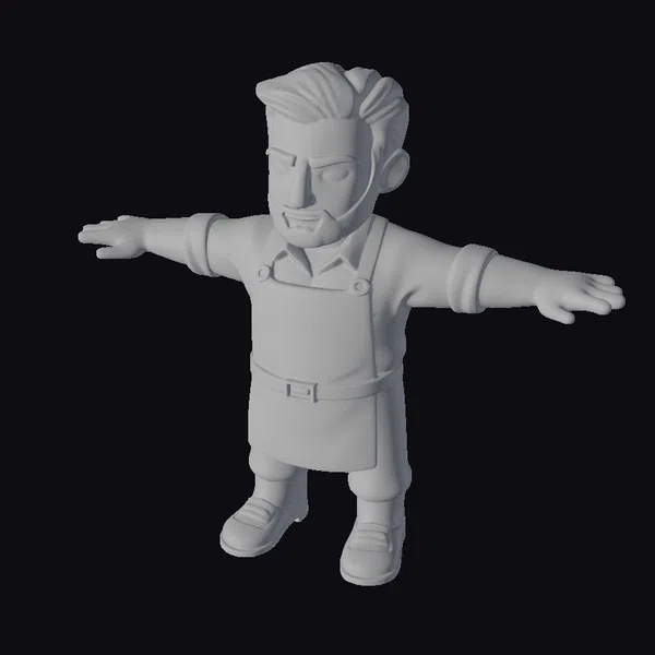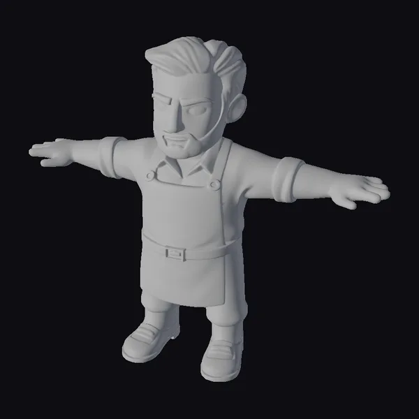 Standing with arms outstretched in a gesture of openness, this artisan character is ready to bring a sense of warmth and approachability to your projects. His green plaid shirt is layered under a gray apron, complete with a black belt and silver buckle, while his dark boots add a rugged touch. The character’s stylized cartoon style features a simplified yet expressive face and body, making him versatile for various applications, from animations and games to print and VR/AR experiences. His friendly demeanor and welcoming posture make him an excellent choice for projects aiming to evoke a sense of community or craftsmanship.