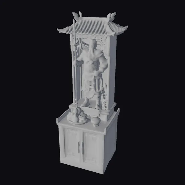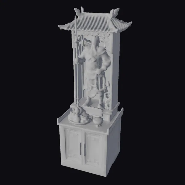 In intricate detail, the shrine’s wooden structure rises in two levels, with the lower cabinet featuring two doors that appear ready to reveal secrets within. Above, the statue of an Asian deity stands proudly, dressed in traditional attire, holding a staff and surrounded by the trappings of a bygone era. The tiled roof, complete with birds perched at its edges, adds a touch of whimsy and life to the overall design. The arrangement of fruits and offerings at the base of the shrine invites contemplation and reverence. This 3D model is perfect for projects requiring a blend of cultural sensitivity and artistic detail, suitable for use in games, 3D printing, VR/AR experiences, animation, and design applications.
