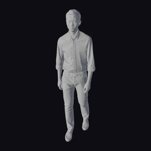 Rendered in a highly realistic style, this 3D model depicts a young Asian male with short black hair, wearing a light blue, rolled-up sleeve shirt, gray pants, and brown shoes. He stands with his feet slightly apart, hands by his sides, and eyes cast downward, exuding a calm and thoughtful demeanor. The model’s detailed facial features, skin texture, and clothing folds showcase exceptional quality. Ideal for use in animations, games, virtual reality experiences, or as a character in digital art projects.