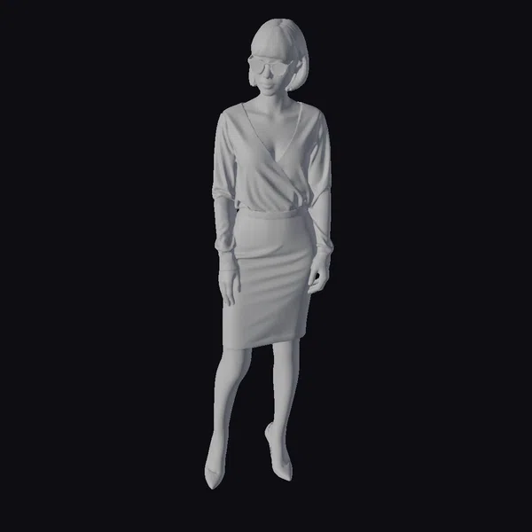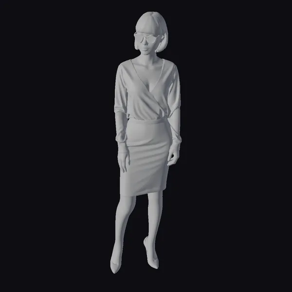 Depicted in a full-body pose, this 3D model showcases a young Asian woman with a slender yet curvy physique, highlighted by her fitted white blouse and pencil black skirt. Her lavender hair, cut in a stylish short bob with bangs, adds a pop of color to her overall appearance. Paired with rimless glasses and black high heels, she projects a professional yet alluring image. The model’s facial features are finely detailed, with a subtle expression that adds to her charm. Her attire, complete with semi-transparent purple stockings and black gloves, suggests a blend of corporate and high fashion. This model is ideal for projects requiring a modern, stylish character, such as animations, games, or virtual reality experiences.