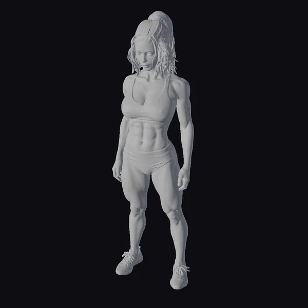 Detailed with precision, this 3D model showcases a woman with a strong and toned physique, her muscles subtly defined beneath her skin. Her dark hair is pulled back into a high ponytail, and she wears a vibrant red sports bra and matching sneakers, paired with black underwear. The model’s downward gaze and relaxed yet powerful stance convey a sense of focused determination. Her facial features are delicately rendered, with a slight furrow between her brows. The model’s proportions are realistic, making her suitable for various applications, including games, animation, 3D printing, and design projects where a realistic human figure is required.