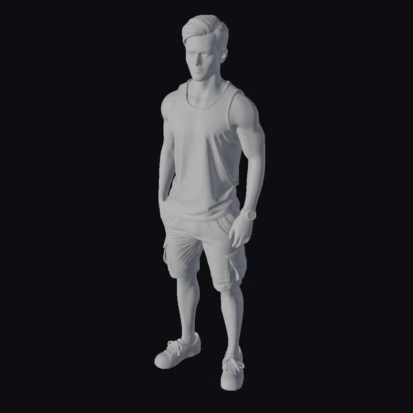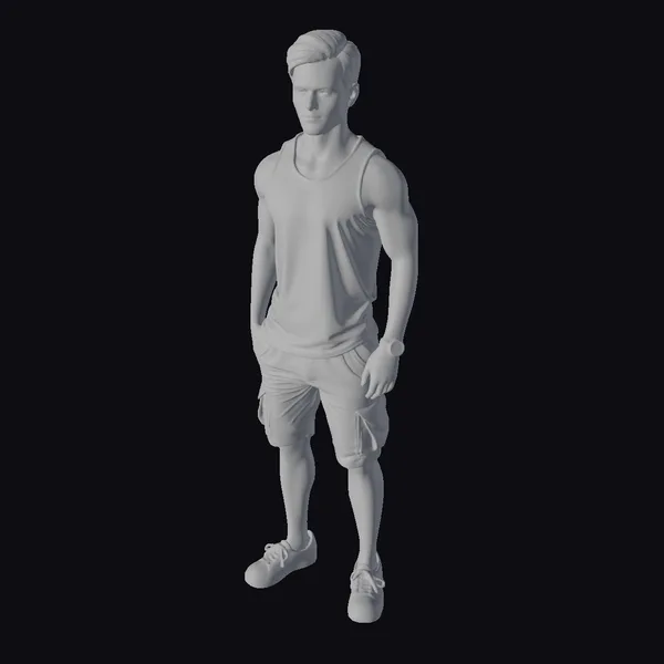 Detailed with a strong, athletic build, this male character model is posed with one hand in his pocket and the other relaxed by his side. His short brown hair and focused gaze contribute to a determined look. The model features a grey sleeveless tank top, beige cargo shorts with black accents, and dark sneakers. A black strap crosses his chest, and a watch adorns his wrist, adding to his utilitarian yet casual appearance. The model’s realistic style makes it suitable for various applications, including game development, animation projects, and virtual reality experiences.
