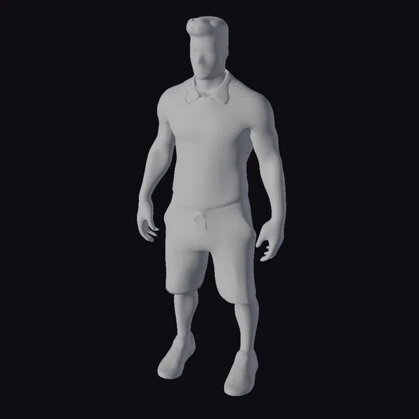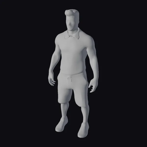 Rendered in exquisite detail, the man’s athletic physique is showcased in a serene standing pose, with his arms relaxed by his sides. His short brown hair complements his facial features, set against a subtle, smooth complexion. The blue polo shirt, adorned with a collar, fits snugly around his torso, while the navy blue swimming trunks, complete with a drawstring waist, accentuate his casual demeanor. Paired with blue sneakers that boast white laces and soles, the ensemble screams summer readiness. This model’s realistic style makes it an excellent choice for projects requiring a lifelike human character, particularly in scenarios demanding a casual, beach-ready appearance. Suitable applications span across games, 3D printing, VR/AR experiences, animations, and design visualizations.
