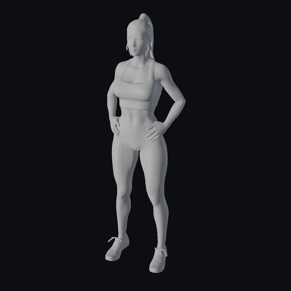Detailed from head to toe, the woman’s realistic features include a high ponytail, defined facial structure, and a toned physique. Her athletic wear consists of a gray sports bra, matching shorts, knee-high socks, and sneakers. The pose accentuates her physique, making her a versatile model for projects requiring a strong, active female presence. Ideal for use in fitness promotions, sports animations, or as a character in games and simulations.