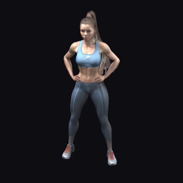 Detailed to perfection, the young woman stands tall with her hands confidently placed on her hips. Her long, brown hair is styled in a high ponytail, complementing her determined expression. She wears a fitted blue sports bra and matching leggings, accentuating her toned physique. The outfit is completed with grey and orange sneakers, adding a pop of color to her overall athletic look. The model’s pose and facial expression convey a sense of strength and focus, making her an ideal choice for projects requiring a dynamic and empowered female character. Her realistic appearance and detailed features make her suitable for various applications, including games, animation, and design.