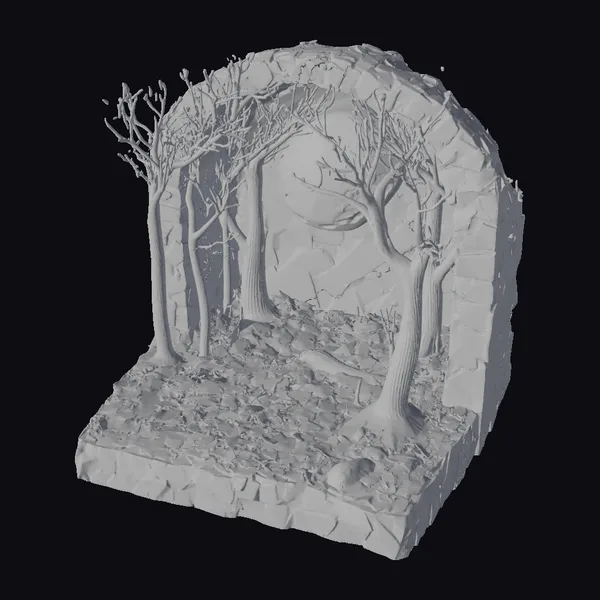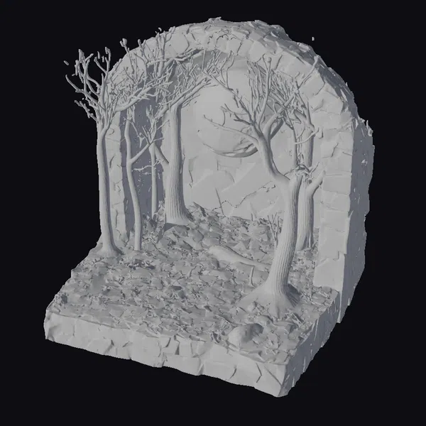 Imagine stepping into a tranquil forest sanctuary under the soft glow of a full moon. This diorama model meticulously captures the essence of an autumnal forest, complete with a scattering of colorful leaves across the ground and towering trees that stand sentinel. The scene is framed by a natural stone arch, enhancing its secluded and mystical ambiance. The distant silhouette of mountains against a moonlit sky adds depth to this serene landscape. Ideal for projects requiring a touch of natural beauty or fantasy, this model can be used in games, animations, virtual reality experiences, or architectural designs to evoke a sense of wonder and calm.