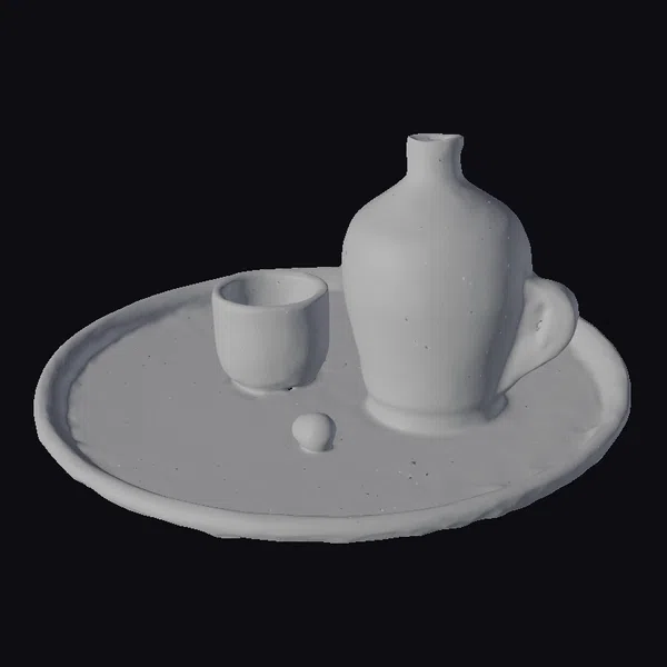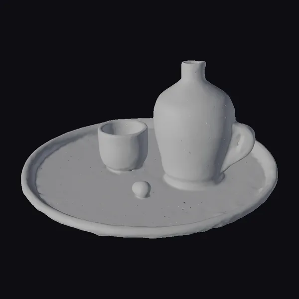 Nestled on a speckled gray plate with a warm brown rim, a short ceramic cup with a subtle gradient from light to dark gray sits alongside a distinctive sake bottle. The bottle’s body is adorned with horizontal ridges, transitioning from brown at the base to a weathered silver-gray towards the top. A small, round object rests near the cup. The entire setting evokes a sense of autumnal tranquility, perfect for adding a touch of seasonal charm to any 3D scene or design project. Ideal for use in games, 3D printing, VR/AR experiences, animations, or architectural visualizations.