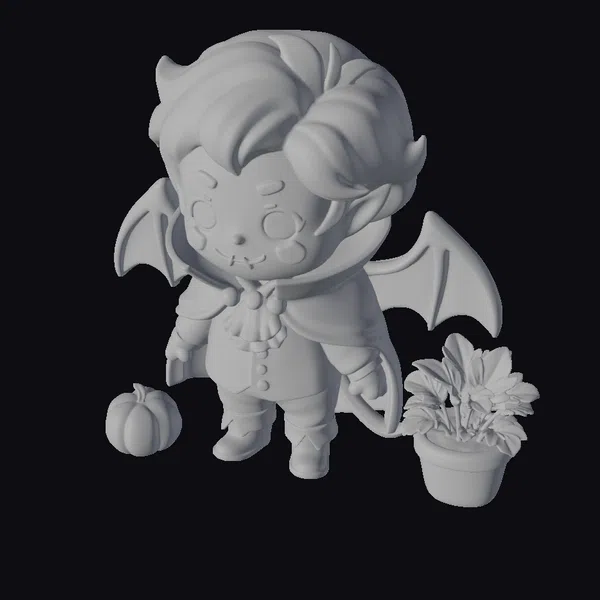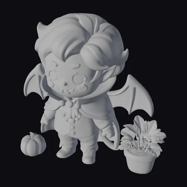 Detailed with precision, this vampire prince stands out with his vibrant red and orange attire, complete with a cape, boots, and a stylish hairdo. His fangs and bat wings add a touch of fantasy, while the accompanying pumpkin and potted plant emphasize the autumn theme. The model’s chibi-style presentation makes it ideal for projects requiring a cute yet eerie character, such as animations, games, or Halloween-themed designs. The high level of detail in the textures, pose, and accessories makes this model versatile for various applications, including 3D printing, VR/AR experiences, and more.