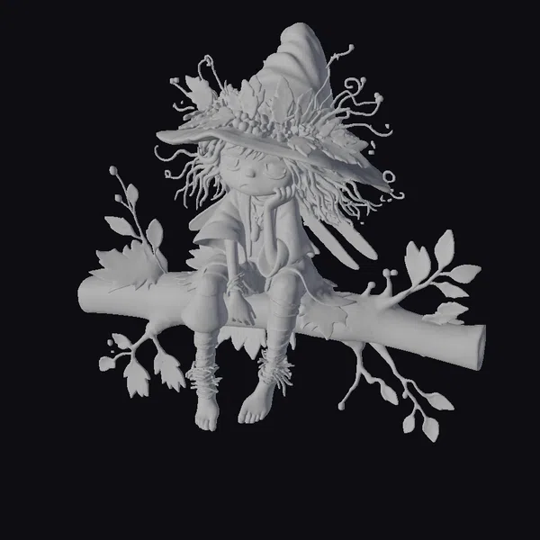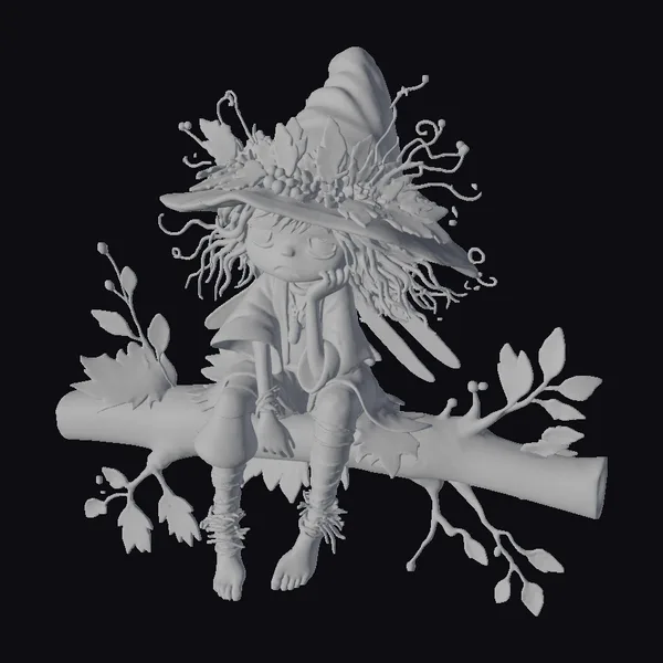 The witch girl sits gracefully on a branch, her body language exuding a sense of relaxed contemplation. Her hat, a masterpiece of autumnal design, features a medley of orange, yellow, and red leaves, complemented by delicate flowers and twigs. The character’s attire is a colorful mix of green, orange, and blue, perfectly capturing the essence of the fall season. The stylized, cartoonish style of the model lends it to various creative applications, including games, animation, and print materials. The intricate details, from the texture of the leaves to the expression on her face, make this model a standout choice for projects requiring a touch of magic and whimsy.