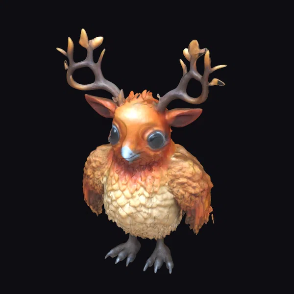 This stylized avian creature stands out with its unique blend of bird-like and deer-like features, set against a clean, white background that accentuates its vibrant colors. The creature’s large, dreamy eyes and soft, textured plumage in shades of orange, brown, and cream, along with its impressive antlers, create a visually striking model. Ideal for use in games, animations, or virtual reality experiences, this model brings a touch of fantasy and whimsy. Its detailed design and high-quality textures make it suitable for professional projects, offering a versatile asset for designers and creators.