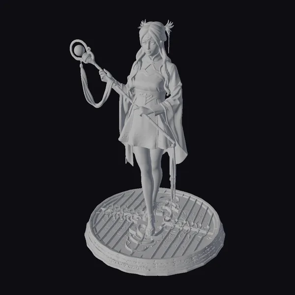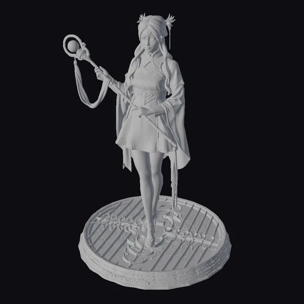 Standing tall on a crystal base, a mystical warrior exudes serene strength in her azure and white ensemble, staff in hand. Her long, dark hair flows like the night, adorned with delicate accessories that catch the light. The intricate details of her dress and the glowing orb on her staff invite you into a world of fantasy and wonder.