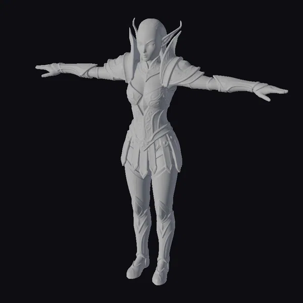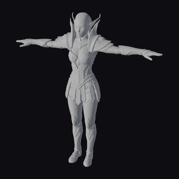 Standing poised with arms outstretched, this azure-hued elf warrior exudes an aura of serene strength. Her armor, a mesmerizing blend of silver and crystal textures, shimmers with purple highlights that catch the light. The intricate design of the armor is meticulously detailed, with curved horns protruding from her shaved head, adding to her otherworldly allure. The pose accentuates the articulated nature of the armor pieces, from the shoulder guards to the greaves on her legs. This model is perfect for projects requiring a blend of fantasy and futurism, suitable for games, animation, VR/AR experiences, and design visualizations.