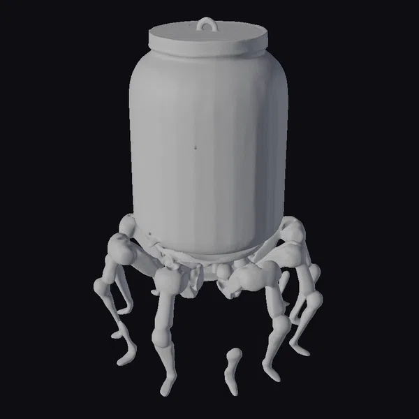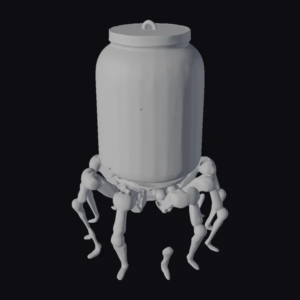 In a pose that seems both serene and unsettling, the baby figurine is encased in a glass jar that appears almost ancient, with a network of fine cracks spreading across its surface like a fragile web. The jar’s lid, made of a dark, possibly metallic material, adds to the enigmatic aura of the piece. The baby, adorned in simple attire, seems to hover in mid-air, adding to the surreal quality of the scene. The base of the jar is encircled by a series of mechanical legs, reminiscent of a spider’s, which not only support the jar but also imbue it with a sense of dynamic movement. These legs, with their intricate joints, suggest a fusion of organic and synthetic elements, blurring the lines between nature and technology. This 3D model would be perfect for projects that require a blend of sci-fi and fantasy elements, such as animations, games, or virtual reality experiences aiming to capture a unique, speculative atmosphere.