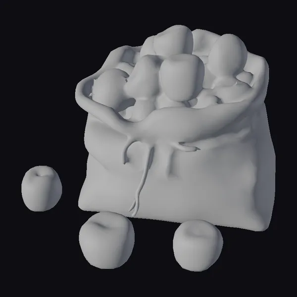Detailed to perfection, the burlap bag is cinched at the top with a sturdy drawstring, its coarse texture and folds meticulously rendered. The bag overflows with a colorful medley of red apples, some of which have spilled out onto the surrounding surface. Each apple boasts a mesmerizing blend of red, green, and yellow hues, with delicate reflections that evoke a sense of freshness. The pristine white background accentuates the warm, earthy tones of the burlap and the rich colors of the apples. Ideal for enhancing scenes in games, animations, or 3D designs where a pop of color and a touch of rustic charm are desired.