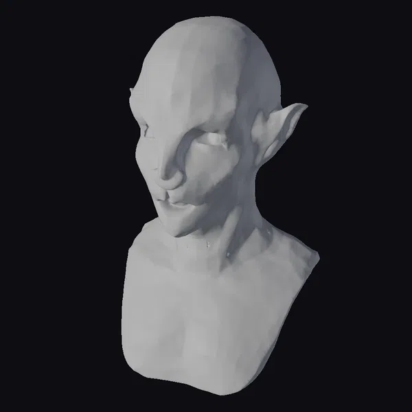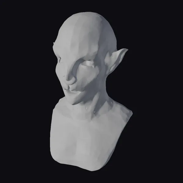 Positioned in a neutral pose, this alien bust presents a serene and enigmatic presence. The smooth, tan skin is devoid of any markings or adornments, drawing focus to the striking features of its face. The pointed ears add a touch of otherworldliness, while the detailed facial structure and expressionless face contribute to its realistic appearance. The muscular neck and subtle curvature of the bust provide a sense of depth and dimensionality. This model is perfect for use in sci-fi projects, games, or animations where a realistic yet alien character is needed.