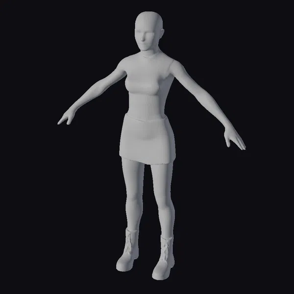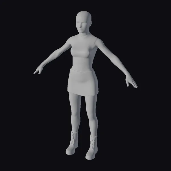 Detailed with perfect human body shape and fingers, this realistic 3D model of a bald female fashion model is posed with her arms outstretched to the sides. Her smooth, shaved head and pale skin contrast with her dark brown sleeveless top and short skirt, completed with matching boots. The model’s facial features are finely detailed, adding to her high-fashion appeal. Ideal for use in games, print media, VR/AR experiences, animation, and design projects where a modern, edgy aesthetic is desired.