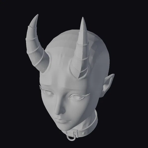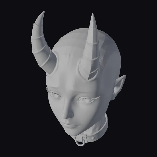 This meticulously crafted 3D model presents a bald, female demon head with striking features. The subject’s pale skin is subtly shaded with rosy cheeks, while her green eyes gleam with an otherworldly intensity. Two dark, sharp horns protrude from her forehead, and a black choker encircles her neck, secured with a silver buckle. The model’s proportions and textures are finely detailed, making it suitable for various applications, including game development, animation, 3D printing, and virtual reality experiences. Its stylized appearance lends itself to both dark fantasy and gothic narratives.