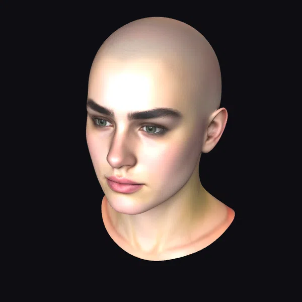 This 3D model presents a bald male head with a highly detailed and realistic appearance. The skin texture, facial structure, and expression are finely tuned to mimic real human features. The model showcases a bald scalp, accentuating the contours of the skull, and a stern facial expression with furrowed eyebrows. The eyes are a striking feature, with a clear, detailed iris and a subtle shine, suggesting a lifelike gaze. The model’s color palette is predominantly flesh tones, with subtle hints of pink on the lips and around the neck area, enhancing its realistic appearance. The pose, while static, offers a clear view of the model’s facial structure, making it suitable for various applications such as game development, animation projects, or architectural visualizations where realistic human elements are required.