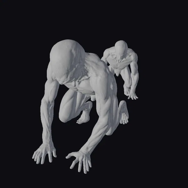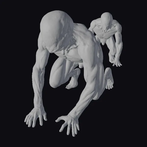 Detailed with precision, these two humanoid creatures are captured in a dynamic crouching position, showcasing their muscular anatomy and bald heads. Their grayish skin, marked with subtle red undertones, adds to their menacing appearance. The texture of their skin and the definition of their muscles are meticulously rendered, making them suitable for use in various applications such as game development, animation projects, or architectural visualizations. The realistic style of these models allows them to blend seamlessly into environments requiring a touch of realism with a dark twist.
