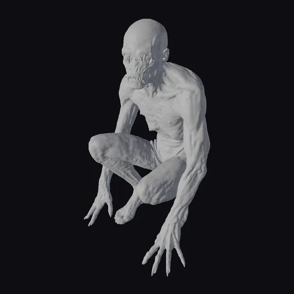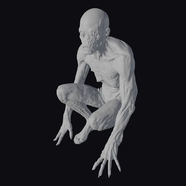 This detailed 3D model depicts a bald humanoid figure in a crouching position, showcasing its muscular build and sharp features. The figure’s bald head and sharp fingernails accentuate its menacing posture. The eerie red glow in its eyes contributes to the overall dark and ominous atmosphere. Ideal for use in horror-themed games, animations, or designs, this model is sure to evoke a sense of fear and unease. Its realistic style and attention to detail make it a valuable asset for creators looking to add a touch of darkness to their projects.