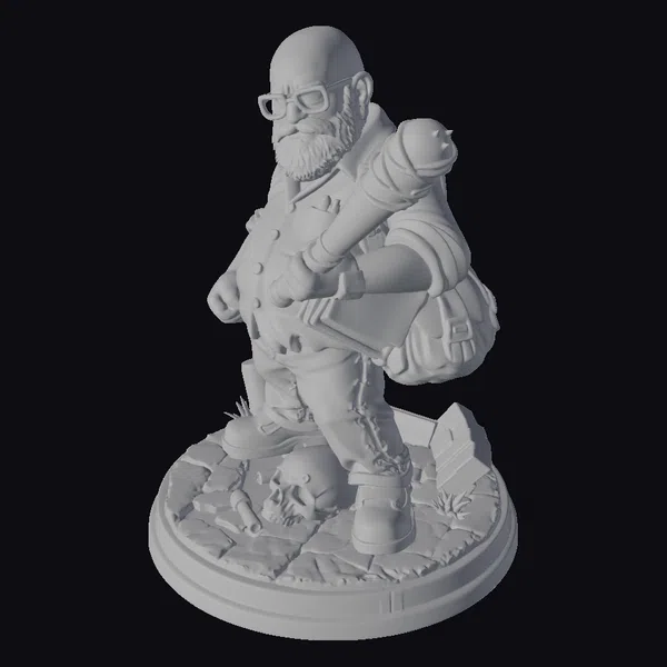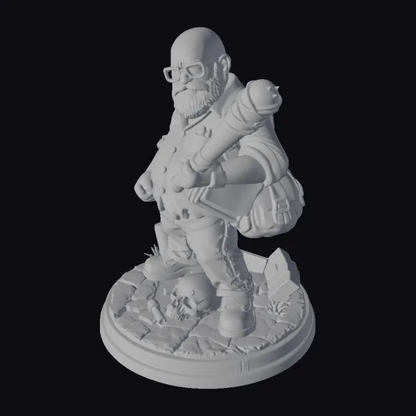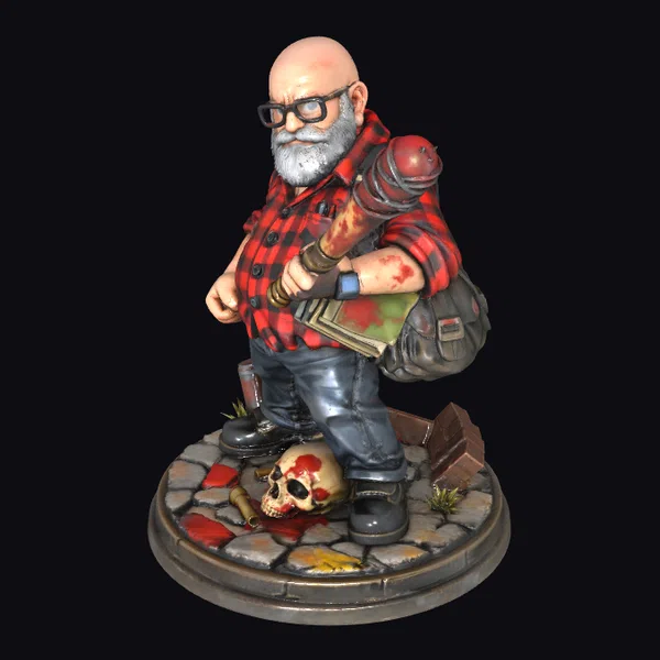 Standing on a circular stone base, this detailed figurine captures a lumberjack warrior in a moment of fierce readiness. His bald head and gray beard contrast with the youthful intensity in his eyes, visible behind a pair of black glasses. The warrior’s red and black plaid shirt is stained with blood, matching the splatters on the axe he grips tightly. A backpack and a book are slung over his shoulder and in his hand, respectively, suggesting a preparedness for battle or survival. At his feet, a human skull and scattered blood on the stones evoke a sense of a recent confrontation. This model is ideal for use in games, 3D printing, VR/AR experiences, animation, and design projects, offering a richly detailed character with a story to tell.