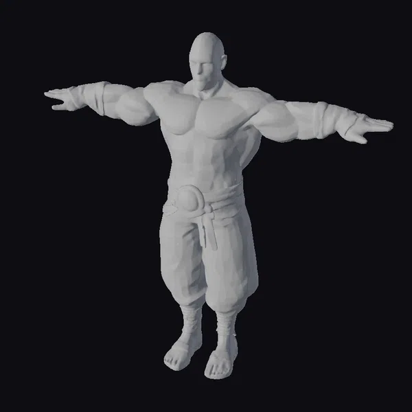 Detailed with precision, this stylized fantasy warrior model showcases a bald, muscular male character in a T-pose, highlighting his impressive physique. His arms are outstretched, palms down, emphasizing his powerful build. The character’s facial features are chiseled, with a focused expression. He wears a grey outfit that includes loose-fitting pants, a red sash around his waist, and fingerless gloves, adding to his warrior aesthetic. The model’s texture and lighting are optimized for high-quality rendering, making it suitable for various applications such as game development, animation projects, and virtual reality experiences.