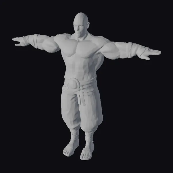 Standing tall with arms outstretched, this powerfully built, bald warrior exudes strength and readiness for battle. His muscular physique is accentuated by a rugged, stylized appearance, complete with a distinctive red sash around his waist and grey attire.