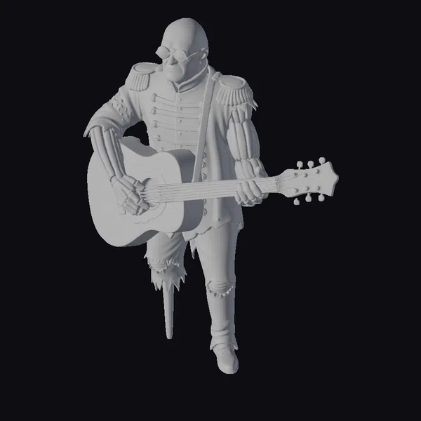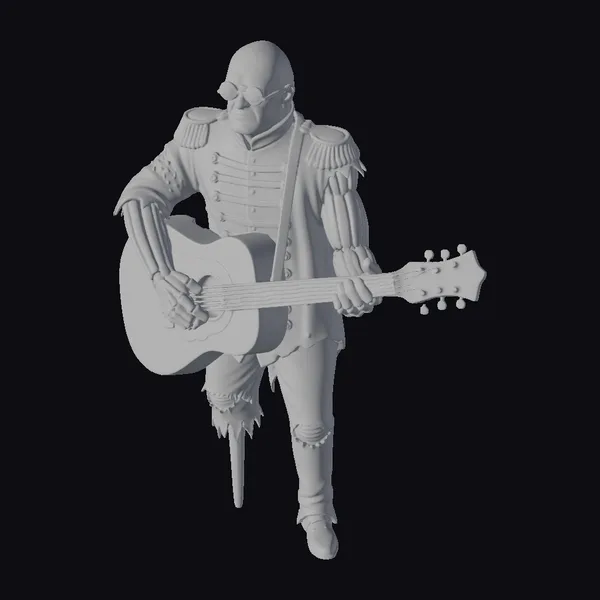 This stylized 3D model captures a bald musician in a dynamic pose, showcasing his ripped and torn attire, complete with a metallic skeletal upper body and bold red jacket adorned with gold accents. His weathered guitar, with visible cracks and green undertones, complements his edgy look. The musician’s sunglasses and bald head add to his punk rock aesthetic. This model is perfect for projects requiring a unique, music-inspired character, such as animations, games, or designs. Its detailed features and stylized appearance make it a standout choice.