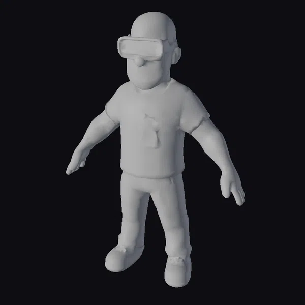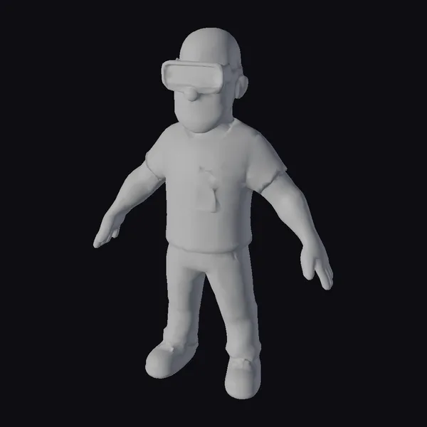 Detailed with precision, this model showcases a bald man with a short beard, dressed in a black ensemble consisting of a t-shirt, pants, and shoes. The focal point is his VR glasses, which are rendered in exquisite detail, along with the neon-lit logo on his shirt that adds a pop of color. The stylized approach gives the model a unique, almost cartoonish appeal. The pose, with arms slightly extended, suggests readiness for action or exploration. This model is perfect for projects related to technology, gaming, or sci-fi narratives, offering a versatile character that can be used in various contexts such as animations, games, or virtual reality experiences.