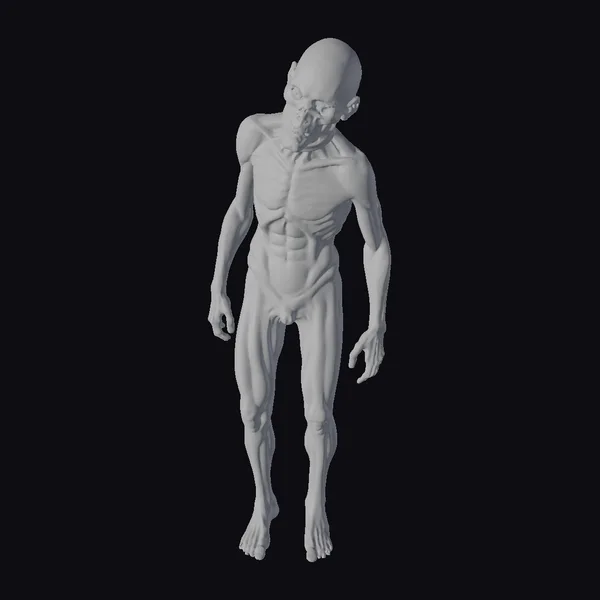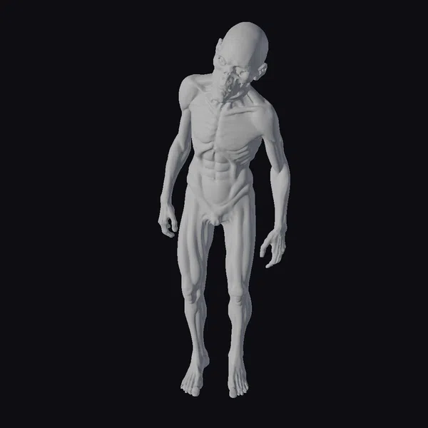 Standing tall with a gaunt, skeletal frame, this bald zombie man exudes an aura of macabre fascination. His muscular build, though decayed, hints at a once formidable physique. The gray skin with subtle red and pastel undertones seems almost lifelike, adding to the uncanny realism. The lack of hair on his head accentuates his skeletal features, while his posture suggests a perpetual stumble through the darkness. This model is perfect for projects requiring a realistic, horror-themed character, suitable for games, print, VR/AR experiences, animation, and design applications.