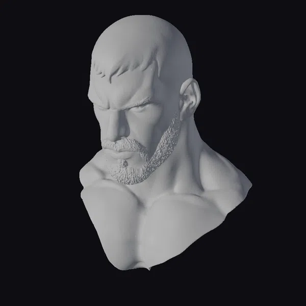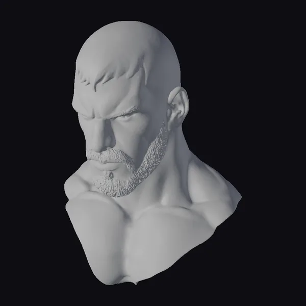 This head bust presents a balding man with a stern expression, showcasing a detailed, realistic portrayal of human anatomy. His skin exhibits a natural texture, with subtle shading that accentuates the contours of his face and neck. The short, dark hair and beard frame his intense features, while the exposed shoulders and chest highlight the muscular structure beneath. Crafted with precision, this model is ideal for projects requiring a lifelike human character, such as games, animation, virtual reality experiences, or detailed design studies.