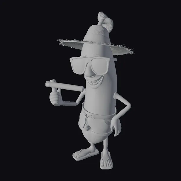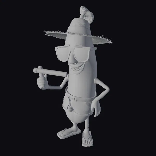 Detailed with precision, this cartoon banana character is posed with confidence, donning a colorful hat adorned with a brown cigar on top and black sunglasses that add to its cool demeanor. The banana’s smile is inviting, and its yellow skin has a smooth texture that catches the light just right. The character’s attire includes a drawstring bag around its waist, adding to its casual, laid-back appearance. Holding a cigar in one hand, the banana seems ready for a fun-filled adventure. Its application is versatile – from game characters to animated scenes, or even as a unique decorative element in design projects.