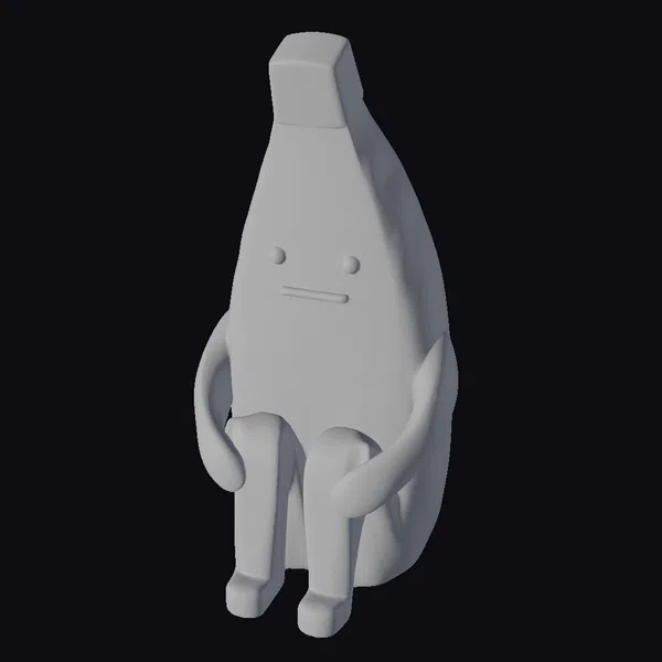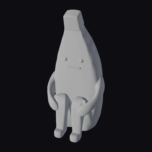 Detailed with precision, this charming banana character sits serenely, its body a vibrant yellow that captures the eye. The chocolate-topped hat adds a touch of sophistication, contrasting beautifully with the banana’s smooth texture. Its facial features are subtly defined, with small eyes and a slight frown that adds to its charm. The arms are bent at the elbows, resting on the knees, which are slightly apart, giving it a relaxed yet contemplative pose. This model is perfect for projects requiring a dash of humor and whimsy, such as animations, games, or even 3D printing. Its cartoonish style ensures it will stand out in any scene.