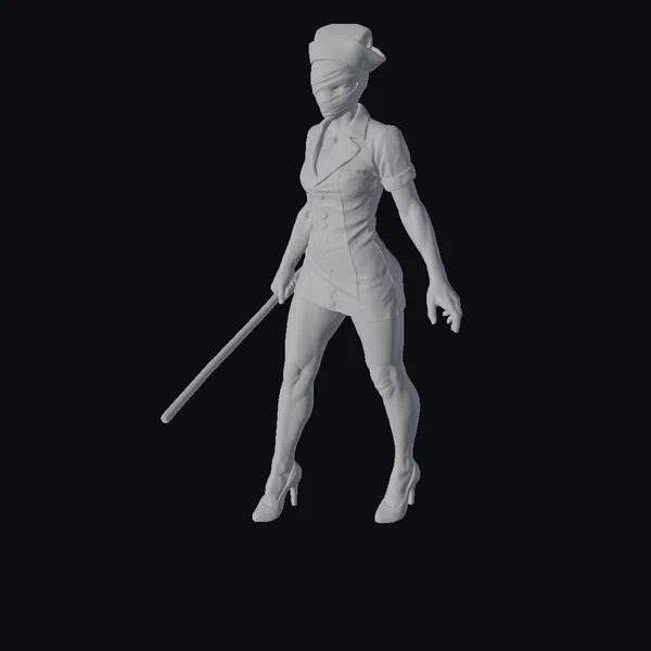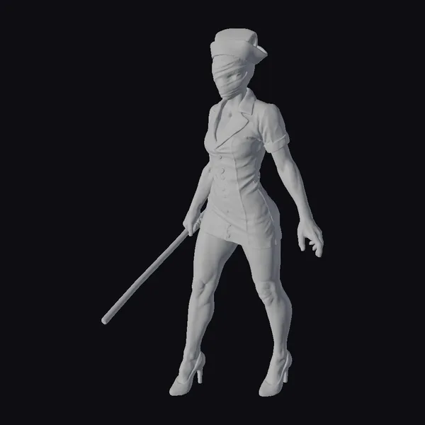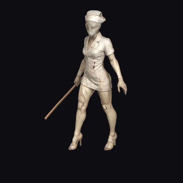This meticulously crafted 3D model presents a nurse with her body wrapped in bandages, reminiscent of a mummy, standing in a relaxed pose with her right hand gripping a club-like object. Her uniform, typically a symbol of care, is here stained with blood, suggesting a macabre twist on the traditional nursing role. The model showcases detailed textures, from the bandages wrapped tightly around her face and body to the high-heeled shoes that add a surreal contrast to her otherwise menacing appearance. The bloodstains on her uniform and the club she holds enhance the horror theme, making this model perfect for projects requiring a dark, eerie character. Suitable for use in horror-themed games, animations, VR/AR experiences, and design projects aiming to evoke a sense of fear or unease.