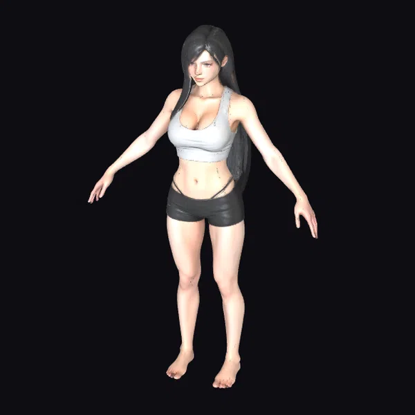 Detailed from head to toe, this 3D model showcases a young woman with a slender physique and long, black hair. She stands with her arms outstretched and is barefoot, adding to her carefree demeanor. Her white crop top and black shorts are rendered with realistic textures, capturing the subtleties of fabric and skin. The model is well-proportioned, with particular attention to detail in her facial features and limbs. Ideal for use in games, animations, or virtual reality experiences where a realistic yet casual character is needed.